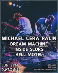Spokane is in store for a treat as we see two great touring bands cross paths on The Big Dipper stage featuring Michael Cera Palin from Atlanta and Dream Machine all the way from Amsterdam, Netherlands! Spokane based bands Inside Slurs and Hell Motel kick the show off with some math and emo rock.